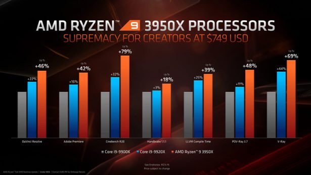 На официальных гистограммах производительности Ryzen 9 3950X сравнивается с Intel Core i9-9900K ($499) и даже с HEDT-процессором Intel Core i9-9920X ($1199).