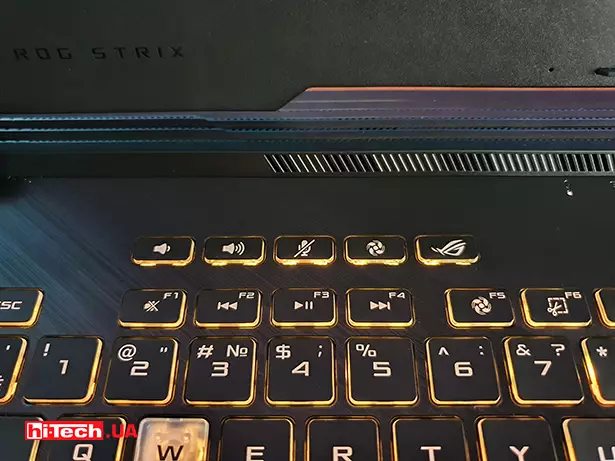 Функциональные кнопки регулировки громкости соседствуют с отключением микрофона, выбором режима производительности (пиктограмма вентилятора) и кнопкой запуска приложения «Armory Crate».
