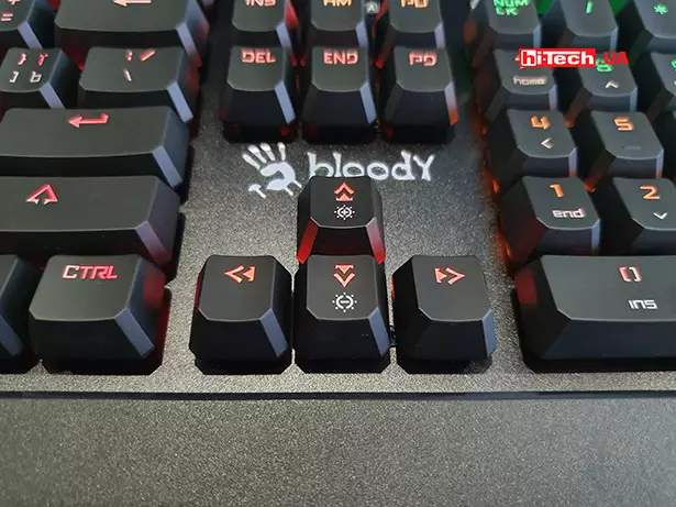Стрелки вверх и вниз регулируют яркость подсветки. Всего есть девять градаций, которые постепенно снижают яркость символов и отключают диоды по бокам клавиатуры.