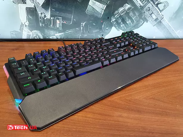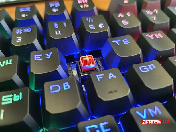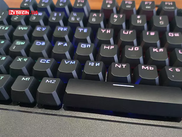 Для модели был выбран дизайн «скелетон», с которым клавиши устанавливаются прямо на основу клавиатуры. Само основание и клавиши выполнены из приятного на ощупь пластика. В комплекте есть сменные колпачки красного цвета для клавиш «Й, Ц, У, К, Ф, І, В, А» и съёмник для них.