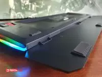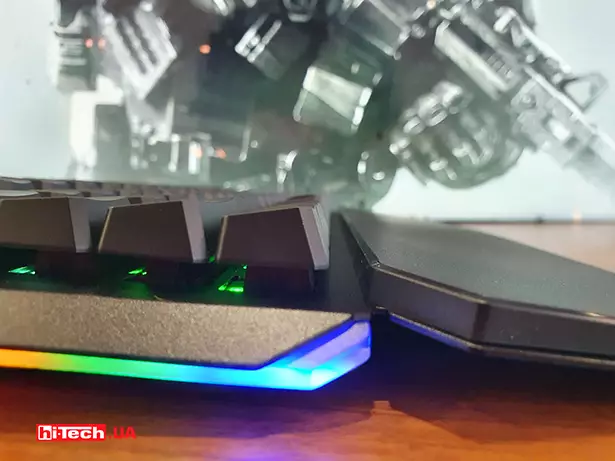 Общая высота кнопок довольно приличная и кроме удобства для чистки от пыли и крошек, можно хорошо рассмотреть ореол подсветки каждой кнопки. По бокам от клавиатуры есть полупрозрачные выступы с интегрированной подсветкой.