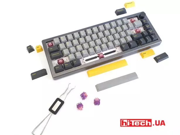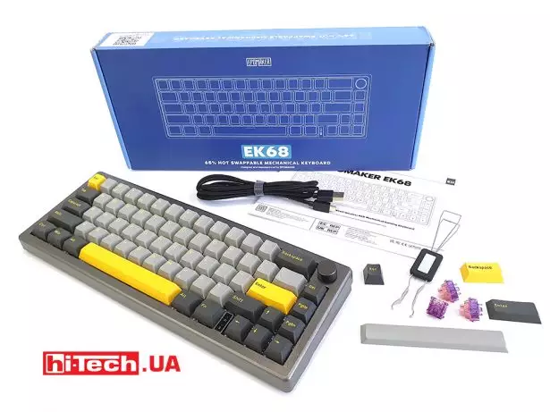 Клавиатура Epomaker EK68 выпускается в нескольких цветовых вариантах: черно-сером, черно-фиолетовом и черно-сером с желтыми акцентами, как в нашем случае.