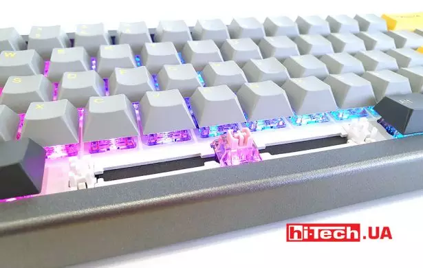 Клава имеет амортизирующий демпфер между переключателями и печатной платой, а также дополнительные вставки из звукопоглощающей пены для снижения паразитных звуков, вибраций, эха и других звуковых артефактов. EK68 хорошо собрана, ничего нигде не скрепит и не люфтит.