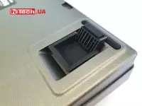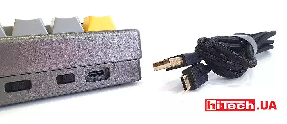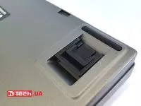 Позади клавиатуры расположены кнопки подключения и порт питания USB-C. Среди кнопок: переключатель раскладки (ПК и Mac), переключатель вариантов подключения (проводное, 2,4 ГГц и Bluetooth) и ниша для USB-ресивера. Клавиатура может запоминать до трех Bluetooth-устройств и быстро переключаться между ними.