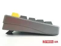 Снизу клавиатуры по периметру есть четыре резиновых проставки. Также есть двойные ножки для клавиатуры под углом. Ножки имеют жесткие резиновые вставки. Клавиатура надежно держится за стол и не ерзает. Клавиатура достаточно высокая, подставки для запястий в комплекте нет, но ее можно купить на сайте производителя.