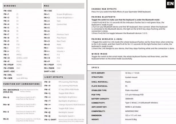 Epomaker EK68 имеет RGB-подсветку с 20 разными эффектами (включая режимы для FPS и MMO игр с подсветкой соответствующих клавиш) и 15 уровнями яркости. PBT-пластик не просвечивается, поэтому с ним подсветка имеет только эстетическую функцию и только видеокремляет клавиши, символы на них в темной обстановке не видны.