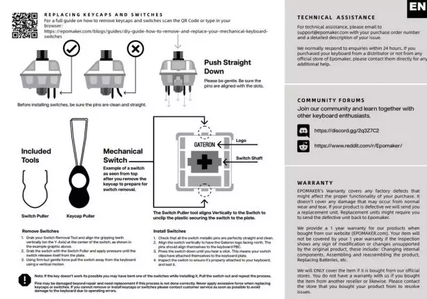 Epomaker EK68 доступна с несколькими переключателями: Gateron Pro 2.0 Black, Gateron Pro 2.0 Yellow, а также фирменными Epomaker Budgerigar и Flamingo, последние и были в нашем случае. Epomaker EK68 поддерживает горячую замену выключателей. Она совместима с большинством 3- и 5-контактных механических переключателей, таких как Cherry, Gateron, Otemu, Kailh.
