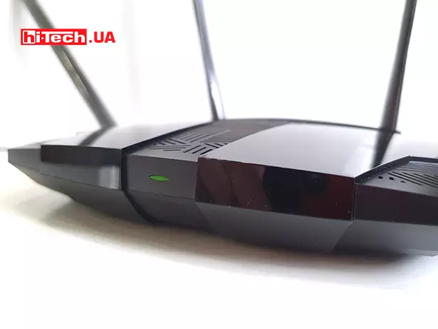 Сам Wi-Fi-маршрутизатор заметно скромнее по габаритам, имеет четыре поворотные антенны с промежуточной фиксацией и модные глянцевые полосы. Глянец маркий и ввиду того, что дизайн устройства можно назвать привлекательным, кто-то может захотеть поставить его на виду. Со временем пыль и отпечатки пальцев также будут хорошо видны.