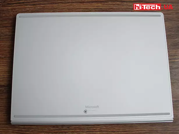 На внешней стороне крышки есть логотип Microsoft, состоящий из зеркальных квадратов. С этой же стороны в углу помещена камера на 8 Мпикс. Ни нижней плоскости нет ничего кроме двух резиновых ножек на всю длину корпуса.
