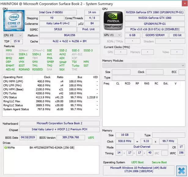 В нашей версии Surface Book 2 может устанавливаться  Intel Core i5-8350U или Core i7-8650U. Это четырехядерные процессоры с восемью потоками инструкций поколения Kaby Lake Refresh. В нашем образце установлен Core i7, характеризующийся частотой 1,9 ГГц и 4,2 ГГц в режиме Turbo Boost.