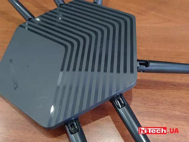 Mercusys MR50G имеет компактный корпус, выполненный в форме шестиугольника. Цветовая палитра исключительно черная, с матовой текстурой, причём это касается даже разъёмов Ethernet, что LAN, что WAN, на тыльной грани. Эстетики добавляют волны того же чёрного цвета, но с глянцевым отблеском. К нам роутер приехал уже с мелкими потёртостями и царапинами на матовой части, так что долговечным пластик не назовёшь.