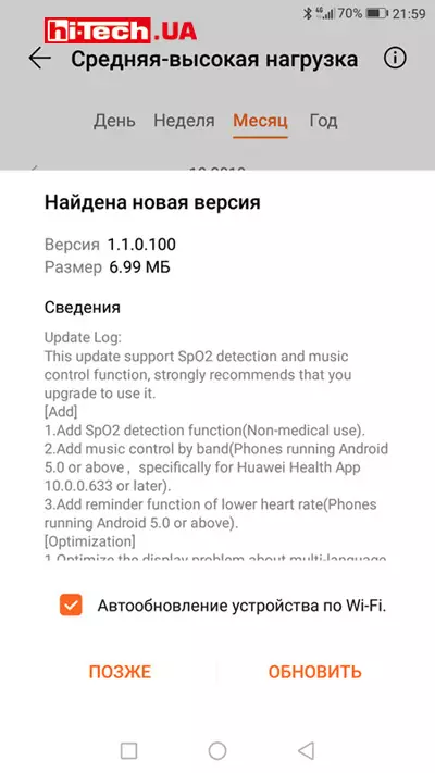 Доступен и непрерывный мониторинг пульса (включается отдельно). При этом частота не будет выводится на экран. Накопленные данные вы сможете анализировать позже уже в самом приложении Huawei Health.