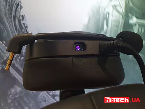 Подключается устройство по кабелю с USB-разъёмом. Кабель длинный и довольно массивный, защищён от перетирания оплёткой. На нём есть пульт управления гарнитурой. Несмотря на довольно большой корпус, кнопок и регуляторов на ней немного. Выведена кнопка отключения подсветки, ползунок активации/деактивации микрофона, а сбоку колесо регулировки громкости.