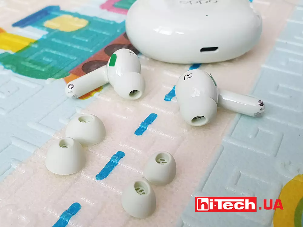 На наружной стороне ножек корпуса наушников расположены сенсорные зоны управления. Со смартфона можно назначить реакции на три типа прикосновений. Каждый наушник имеет по два микрофона – один снизу ножки, второй по амбушуру.