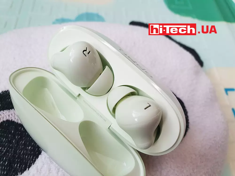 Из интересных дизайнерских решений буквы правого и левого наушника не нерисованы, а вырезаны в корпусе. На крышке кейса имеется прозрачная часть, под которой виден рельеф в форме волн или срезов. Выглядит интересно, хотя заметно не сразу. Корпус наушников совпадает по цвету с кейсом – нежный зеленый цвет. Может быть также классический белый.