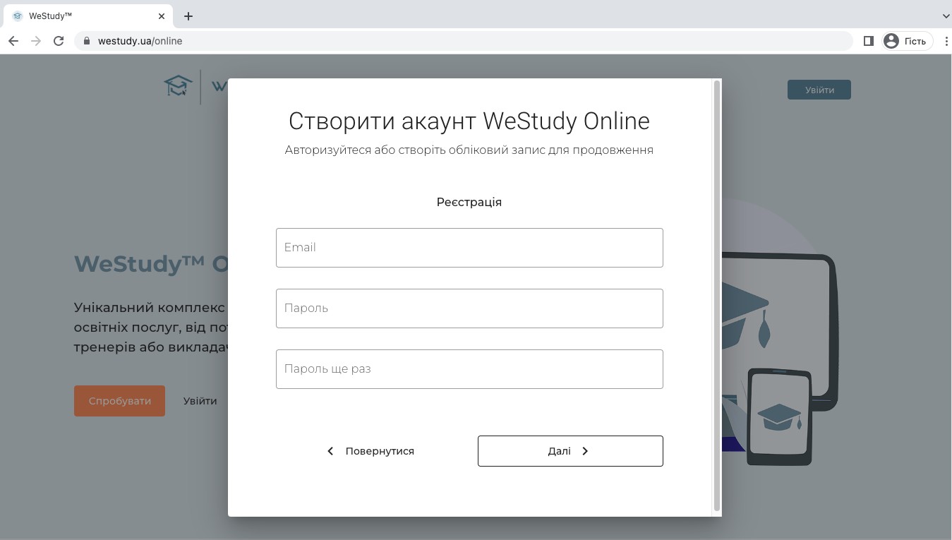 Регистрация в платформе WeStudy
