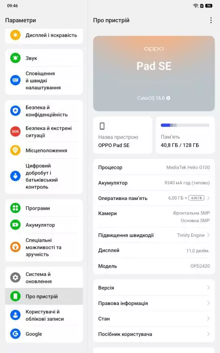 Characteristics of the Oppo PadSE tablet (OPD2420)
