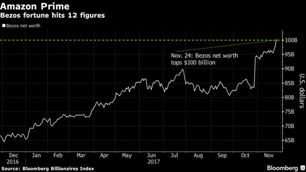 За 2017 год капитал Безоса вырос на $32,6 млрд, а цена акций Amazon за неделю с 20 ноября выросли на 5%.