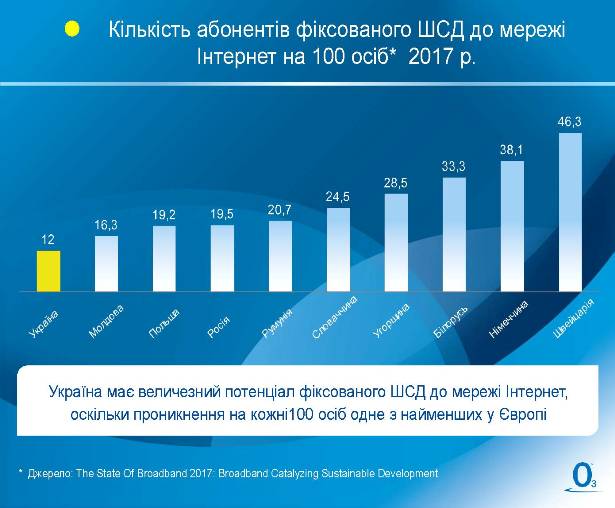 - Украина имеет огромный потенциал фиксированного ШПД к сети Интернет, поскольку проникновение на каждые 100 человек — одно из самых маленьких в Европе. Но это обусловлено прежде всего некоторыми ограничения (например, недостаточным количеством инвестиций).