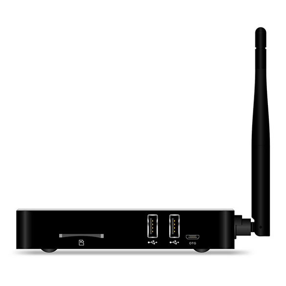 На фронтальной грани нет никаких портов, кроме инфракрасного приемника. На боковой стороне выведены два порта USB 2.0, OTG-разъем и кард ридер. Благодаря OTG, вы сможете перемещать файлы с мобильных устройств на медиаплеер. На задней стенке — интерфейс HDMI 2.0, один USB 2.0 и S/PDIF для вывода цифрового звукового сигнала. Там же расположен разъем для блока питания и выведена антенна Wi-Fi. Передатчик двух диапазонный и работает на частоте 2,4ГГц и 5,8 ГГц со стандартом AC, который как раз недавно сертифицировали в Украине.