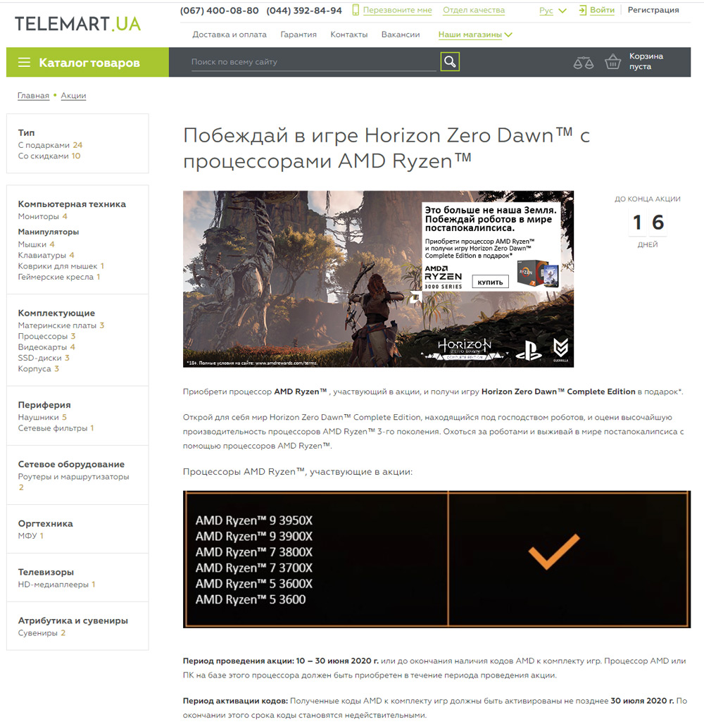 Осмотрев несколько интернет-магазинов лишь на сайте Telemart (telemart.ua) удалось найти упоминание об акции и инструкцию по получению игры Horizon Zero Dawn.