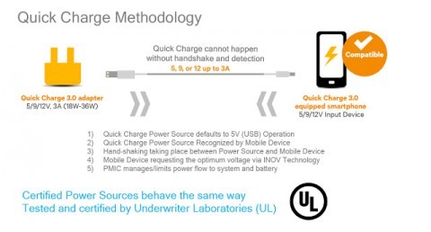 Подобные системы способны зарядить гаджет до 40% всего за 20 минут. Весь секрет кроется в мощном блоке питания и контроллере. Последний беспрерывно получает от телефона сигналы об уровне заряда. Это позволяет подбирать оптимальное напряжение. Стоит отметить, что пиковую скорость можно получить только для практически разряженного устройства. После 40% блок питания не будет выдавать большие значения.