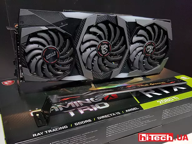 Из комплектующих стоит отметить видеокарту MSI GeForce RTX 2080 Ti Gaming X Trio, которая охлаждается массивным кулером Tri-Frozr с пятью тепловыми трубками и тремя вентиляторами Torx 3.0 разного диаметра. Она имеет два 8-контактных разъёма питания PCI-E Power. В её основе лежит графический процессор NVIDIA TU104-400A, взаимодействующий с 8 ГБ памяти GDDR6. Для вывода изображения используются три разъёма DisplayPort 1.4 и единичный HDMI 2.0b. Кроме того, доступен порт USB-C — он необходим для подключения VR-шлемов по технологии VirtualLink (DisplayPort 1.4/USB 3.1).