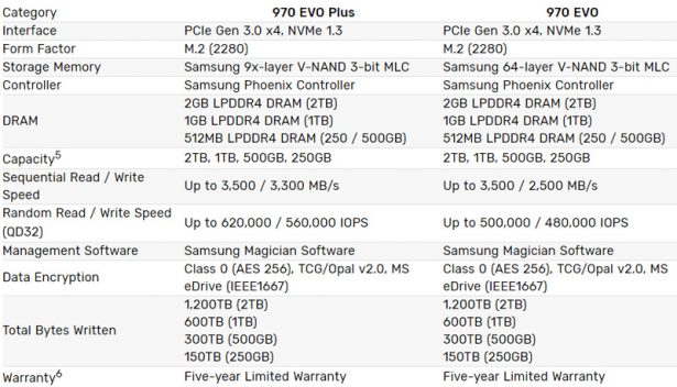 Производитель приводит сравнительную таблицу характеристик нового Samsung 970 EVO Plus и модели-предшественницы 970 EVO.