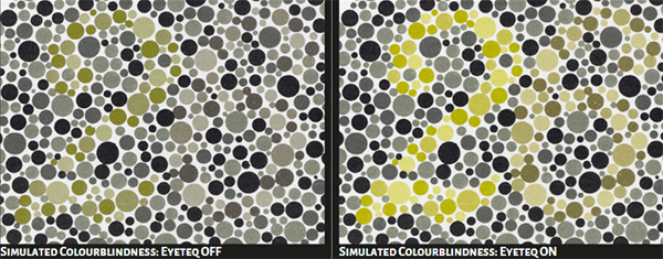 Система Eyeteq использует математические модели, чтобы распознать труднодоступные для дальтоников участки, причем ранее технология могла проводить подобные исследования только для статических картинок. Теперь же разработан способ анализа на предмет тяжелых для восприятия участков и для видео. Технология идентифицирует необходимые точки и осуществляет их цветокоррекцию, согласно потребностям дальтоников в режиме реального времени.