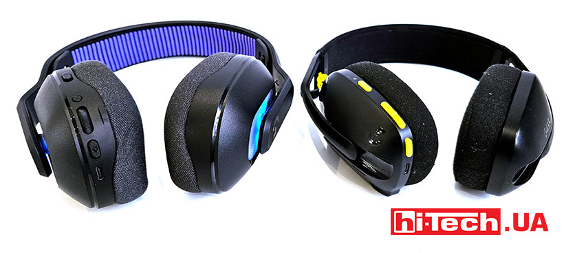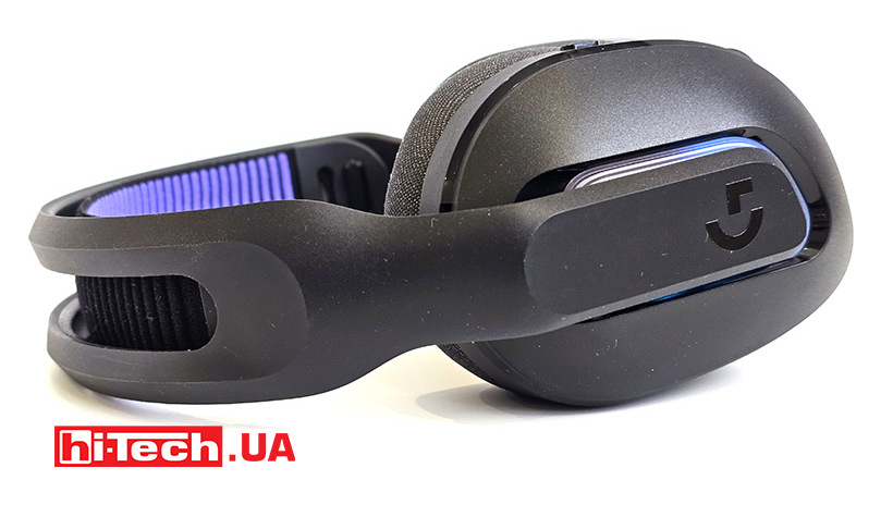 Половини корпусу динаміків з’єднані не регульованим оголов’ям. Корпус та оголов’я виконані із пластику. Він не маркий і стійкий до слідів після дотиків. Є глянсові елементи екстер’єру – логотип G на зовнішній стороні та смуга навколо місць кріплень та по периметру корпусів. Інша прикраса – підсвічування навколо тих самих шарнірів, що з’єднують з оголов’ям. Вона має кілька зон і може налаштовуватися із програми G Hub.